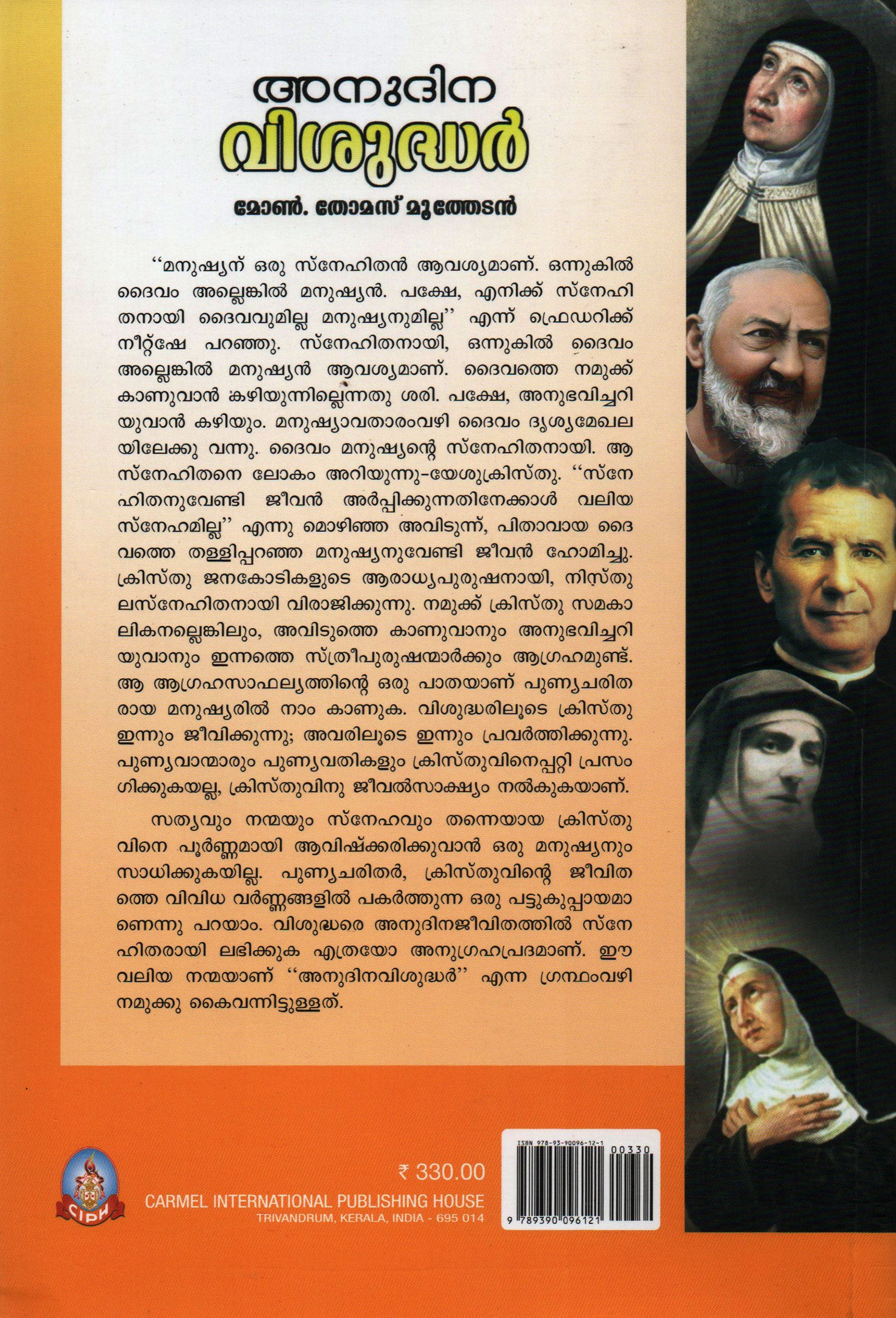 മനുഷ്യന് ഒരു സ്നേഹിതൻ ആവശ്യമാണ് . ഒന്നുകിൽ ദൈവം അല്ലെങ്കിൽ മനുഷ്യൻ . പക്ഷേ , എനിക്ക് സ്നേഹിതനായി ദൈവവുമില്ല . മനുഷ്യനുമില്ല ' ' എന്ന് ഫഡറിക്ക് നീറ്റ്ഷേ പറഞ്ഞു . സ്നേഹിതനായി , ഒന്നുകിൽ ദൈവം അല്ലെങ്കിൽ മനുഷ്യൻ ആവശ്യമാണ് . ദൈവത്തെ നമുക്ക് കാണുവാൻ കഴിയുന്നില്ലെന്നതു ശരി . പക്ഷേ , അനുഭവിച്ചറിയുവാൻ കഴിയും . മനുഷ്യാവതാരംവഴി ദൈവം ദൃശ്യമേഖലയിലേക്കു വന്നു . ദൈവം മനുഷ്യന്റെ സ്നേഹിതനായി . ആ സ്നേഹിതനെ ലോകം അറിയുന്നു യേശുക്രിസ്തു . “സ്നേഹിതനുവേണ്ടി ജീവൻ അർപ്പിക്കുന്നതിനേക്കാൾ വലിയ സ്നേഹമില്ല ' എന്നു മൊഴിഞ്ഞ് അവിടുന്ന് , പിതാവായ ദൈവത്തെ തള്ളിപ്പറഞ്ഞ മനുഷ്യനുവേണ്ടി ജീവൻ ഹോമിച്ചു . ക്രിസ്തു ജനകോടികളുടെ ആരാധ്യപുരുഷനായി , നിലസ്നേഹിതനായി വിരാജിക്കുന്നു . നമുക്ക്ക്രിസ്തു സമകാലികനല്ലെങ്കിലും , അവിടുത്തെ കാണുവാനും അനുഭവിച്ചറിയുവാനും ഇന്നത്തെ സ്ത്രീപുരുഷന്മാർക്കും ആഗ്രഹമുണ്ട് . ആ ആഗ്രഹസാഫല്യത്തിന്റെ ഒരു പാതയാണ് പുണ്യചരിതരായ മനുഷ്യരിൽ നാം കാണുക . വിശുദ്ധരിലൂടെ ക്രിസ്തഇന്നും ജീവിക്കുന്നു ; അവരിലൂടെ ഇന്നും പ്രവർത്തിക്കുന്നു . പുണ്യവാന്മാരും പുണ്യവതികളും ക്രിസ്തുവിനെപ്പറ്റി പ്രസംഗിക്കുകയല്ല , ക്രിസ്തുവിനു ജീവൽ സാക്ഷ്യം നൽകുകയാണ് . സത്യവും നന്മയും സ്നേഹവും തന്നെയായ ക്രിസ്തവിനെ പൂർണ്ണമായി ആവിഷ്ക്കരിക്കുവാൻ ഒരു മനുഷ്യനും സാധിക്കുകയില്ല . പുണ്യചരിതർ , ക്രിസ്തുവിന്റെ ജീവിതത്തെ വിവിധ വർണ്ണങ്ങളിൽ പകർത്തുന്ന ഒരു പട്ടുകുപ്പായമാണെന്നു പറയാം . വിശുദ്ധരെ അനുദിനജീവിതത്തിൽ ഹിതരായിലഭിക്കുക എത്രയോ അനുഗ്രഹപ്രദമാണ് . ഈ വലിയ നന്മയാണ് “ അനുദിനവിശുദ്ധർ ' എന്ന ഗ്രന്ഥം വഴി നമുക്കു കൈവന്നിട്ടുള്ളത്
