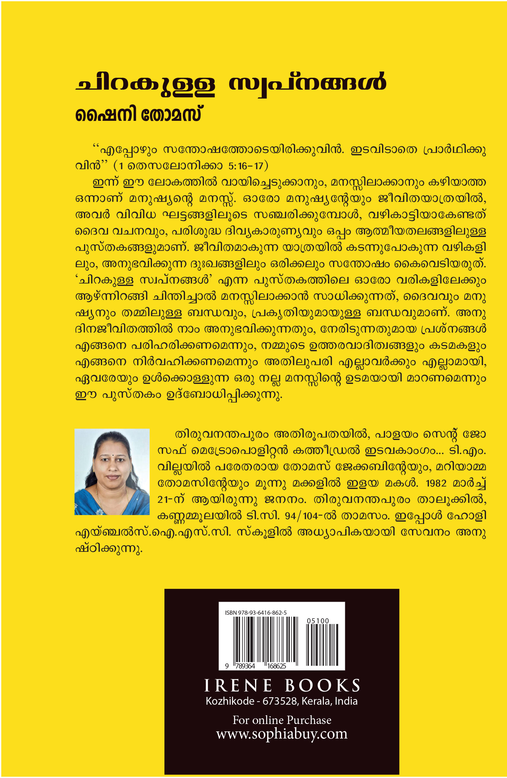 ഇന്ന് ഈ ലോകത്തിൽ വായിച്ചെടുക്കാനും, മനസ്സിലാക്കാനും കഴിയാത്ത ഒന്നാണ് മനുഷ്യൻ്റെ മനസ്സ്. ഓരോ മനുഷ്യൻ്റേയും ജീവിതയാത്രയിൽ, അവർ വിവിധ ഘട്ടങ്ങളിലൂടെ സഞ്ചരിക്കുമ്പോൾ, വഴികാട്ടിയാകേണ്ടത് ദൈവ വചനവും, പരിശുദ്ധ ദിവ്യകാരുണ്യവും ഒപ്പം ആത്മീയതലങ്ങളിലുള്ള പുസ്തകങ്ങളുമാണ്. ജീവിതമാകുന്ന യാത്രയിൽ കടന്നുപോകുന്ന വഴികളി ലും, അനുഭവിക്കുന്ന ദുഃഖങ്ങളിലും ഒരിക്കലും സന്തോഷം കൈവെടിയരുത്. 'ചിറകുള്ള സ്വപ്നങ്ങൾ' എന്ന പുസ്തകത്തിലെ ഓരോ വരികളിലേക്കും ആഴ്ന്നിറങ്ങി ചിന്തിച്ചാൽ മനസ്സിലാക്കാൻ സാധിക്കുന്നത്, ദൈവവും മനു ഷ്യനും തമ്മിലുള്ള ബന്ധവും, പ്രകൃതിയുമായുള്ള ബന്ധവുമാണ്. അനു ദിനജീവിതത്തിൽ നാം അനുഭവിക്കുന്നതും, നേരിടുന്നതുമായ പ്രശ്നങ്ങൾ എങ്ങനെ പരിഹരിക്കണമെന്നും, നമ്മുടെ ഉത്തരവാദിത്വങ്ങളും കടമകളും എങ്ങനെ നിർവഹിക്കണമെന്നും അതിലുപരി എല്ലാവർക്കും എല്ലാമായി, ഏവരേയും ഉൾക്കൊള്ളുന്ന ഒരു നല്ല മനസ്സിൻ്റെ ഉടമയായി മാറണമെന്നും ഈ പുസ്തകം ഉദ്ബോധിപ്പിക്കുന്നു
