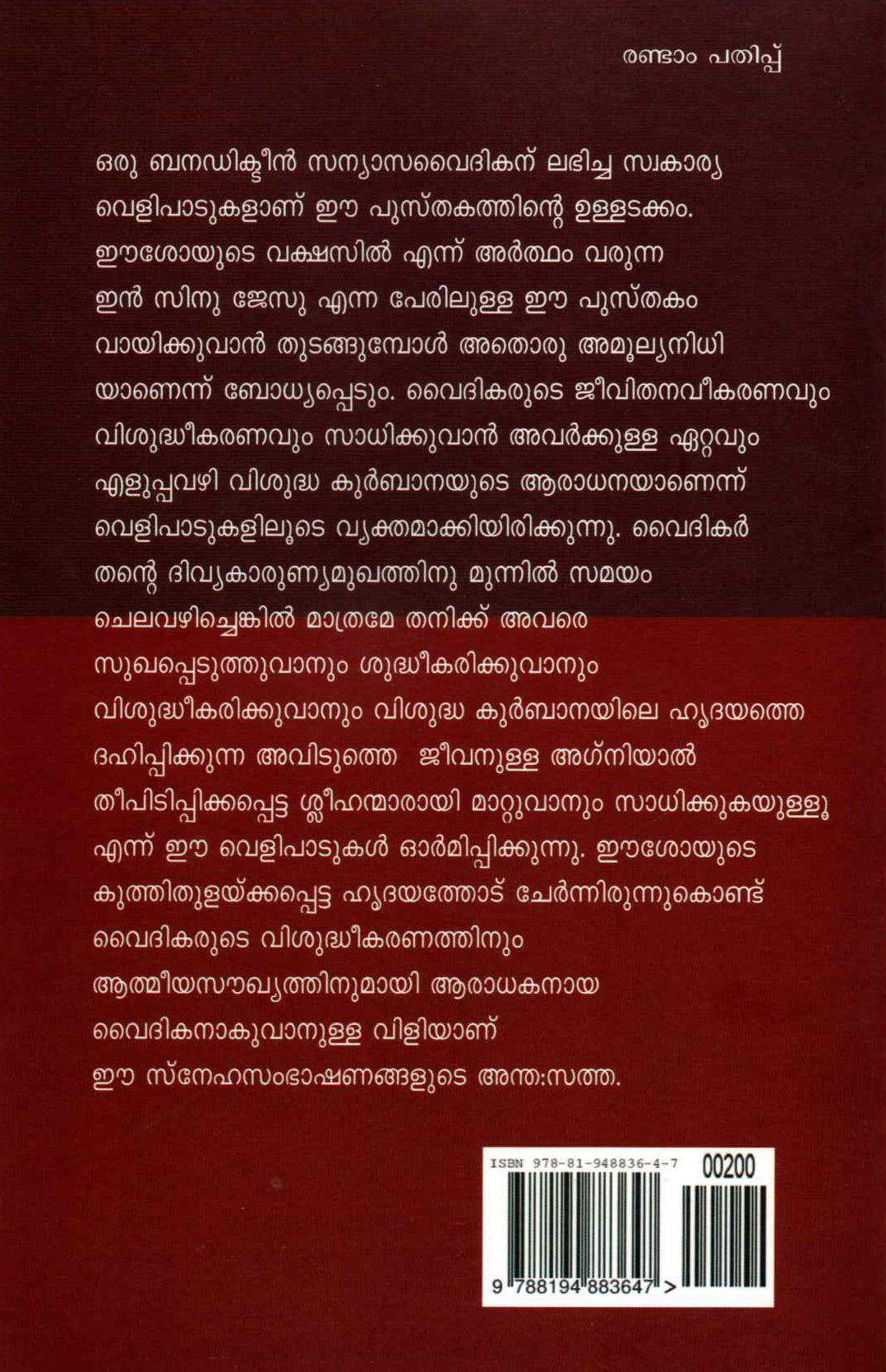 ഒരു ബനഡിക്ടീൻ സന്യാസവൈദികന് ലഭിച്ച സ്വകാര്യ വെളിപാടുകളാണ് ഈ പുസ്തകത്തിന്റെ ഉള്ളടക്കം . ഈശോയുടെ വക്ഷസിൽ എന്ന് അർത്ഥം വരുന്ന ഇൻ സിനു ജേസു എന്ന പേരിലുള്ള ഈ പുസ്തകം വായിക്കുവാൻ തുടങ്ങുമ്പോൾ അതൊരു അമൂല്യനിധി യാണെന്ന് ബോധ്യപ്പെടും . വൈദികരുടെ ജീവിതനവീകരണവും വിശുദ്ധീകരണവും സാധിക്കുവാൻ അവർക്കുള്ള ഏറ്റവും എളുപ്പവഴി വിശുദ്ധ കുർബാനയുടെ ആരാധനയാണെന്ന് വെളിപാടുകളിലൂടെ വ്യക്തമാക്കിയിരിക്കുന്നു . വൈദികർ തന്റെ ദിവ്യകാരുണ്യമുഖത്തിനു മുന്നിൽ സമയം ചെലവഴിച്ചെങ്കിൽ മാത്രമേ തനിക്ക് അവരെ സുഖപ്പെടുത്തുവാനും ശുദ്ധീകരിക്കുവാനും വിശുദ്ധീകരിക്കുവാനും വിശുദ്ധ കുർബാനയിലെ ഹൃദയത്തെ ദഹിപ്പിക്കുന്ന അവിടുത്തെ ജീവനുള്ള അഗ്നിയാൽ തീപിടിപ്പിക്കപ്പെട്ട ശ്ലീഹന്മാരായി മാറ്റുവാനും സാധിക്കുകയുള്ളൂ എന്ന് ഈ വെളിപാടുകൾ ഓർമിപ്പിക്കുന്നു . ഈശോയുടെ കുത്തിതുളയ്ക്കപ്പെട്ട ഹൃദയത്തോട് ചേർന്നിരുന്നുകൊണ്ട് വൈദികരുടെ വിശുദ്ധീകരണത്തിനും ആത്മീയസൗഖ്യത്തിനുമായി ആരാധകനായ വൈദികനാകുവാനുള്ള വിളിയാണ് ഈ സ്നേഹസംഭാഷണങ്ങളുടെ അന്തഃസത്ത